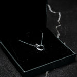 השרשרת מורכבת משרשרת עדינה ומצוידת בתליון מרהיב של שני חישוקים מעוטרים בזירקונים מבריקים.